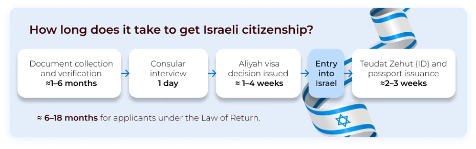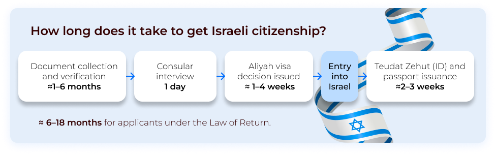 Total timeframe: approximately 6–18 months for applicants under the Law of Return. Naturalization (for non-eligible applicants) typically requires at least 3 years of residence in Israel.